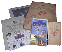 Before the Deluxe CAV Letterbox Edition (below) was released for laserdisc collectors, this handsome boxed set was the ultimate in TLK home-viewing nirvana. It in fact does have a few things that the boxed laserdisc set does not have: an exclusive lithograph of Rafiki and Simba (in some editions), a commemorative "Circle of Life" epigraph, and a certificate of authenticity. It also has the six concept-art lithographs that appear in the CAV boxed set, as well as (of course) the standard VHS video and another tape with the "Making of The Lion King" half-hour show. However, it does not have the extra video goodies (storyboards, character designs, rough animation, etc.) that are found in the deluxe laserdisc edition. This boxed set sold for just under $100 when it was in stores; expect to pay more than that if you find a collector willing to part with his or her copy.