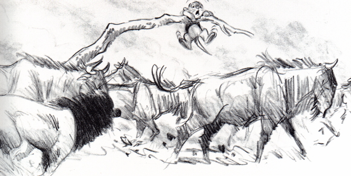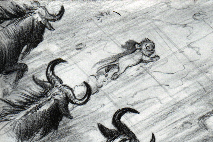 Simba running from the wildebeest |